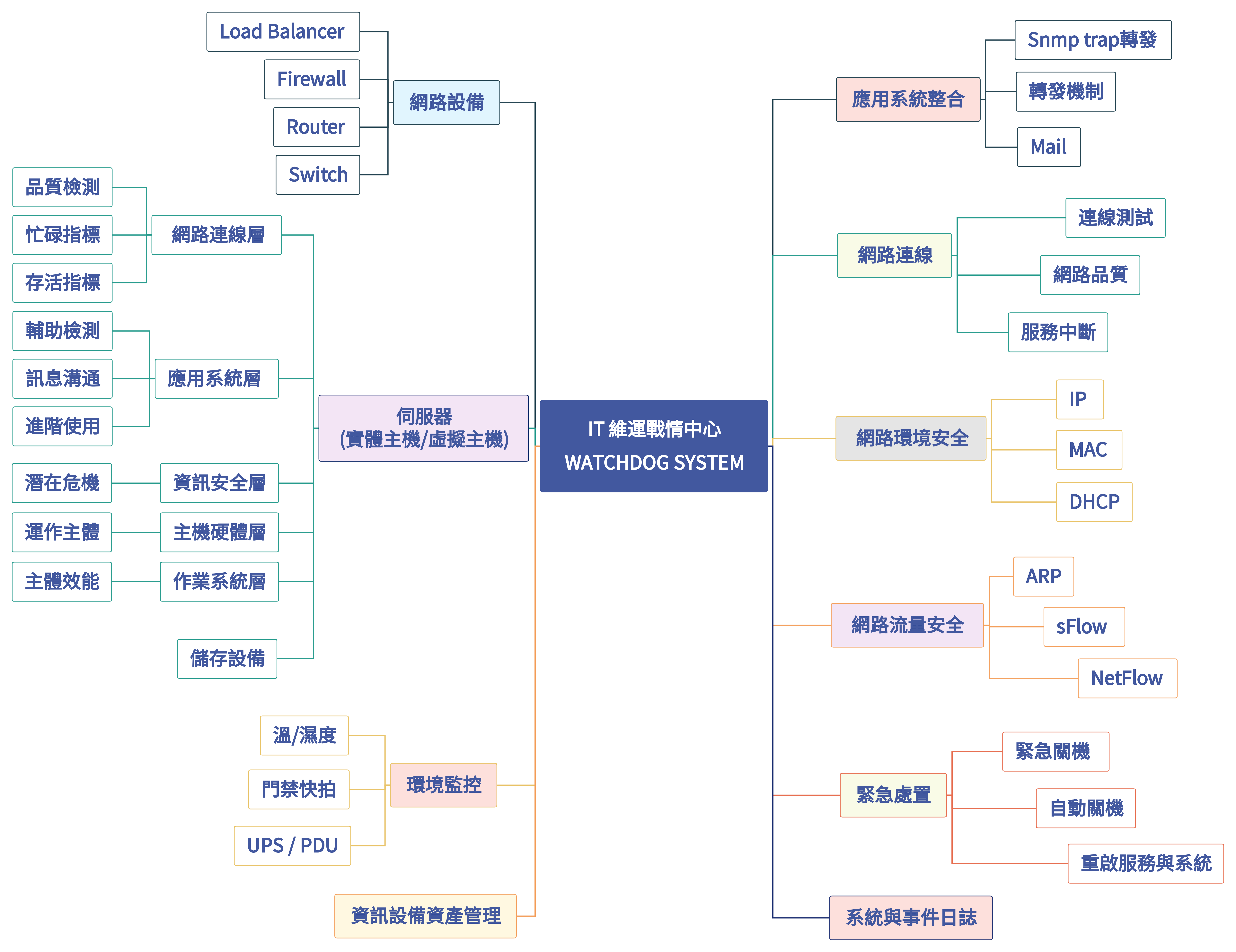 WATCHDOG系統建立於Linux平台上,透過台灣團隊以C語言撰寫的程式,在維運管理上提供全方位的偵測。