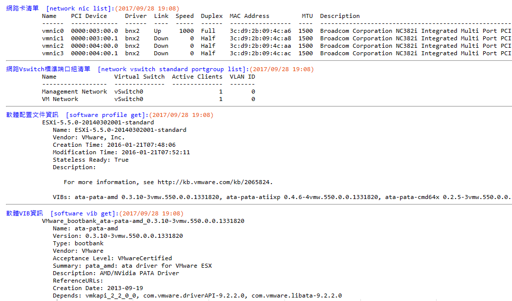 Collects relevant information of the host, including the operating system version, installed VIBs, etc. There is a lot of collected content, which can be searched according to the needs.