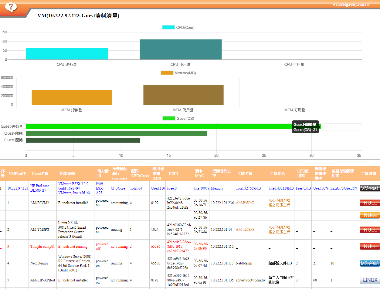 This detection page covers key monitoring information including the virtual guest (Guest host) list and their resource allocation status.